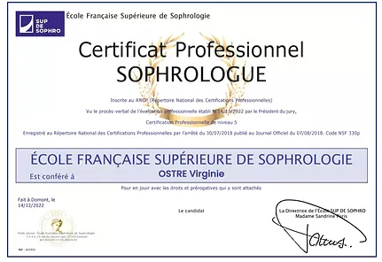 Diplômée de l’École Française Supérieure de Sophrologie RNCP Niveau 5