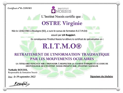 • Certification de spécialisation RITMO (Retraitement de l’information traumatique par les mouvements oculaires) et Technique EFT (Emotional Freedom Technique).