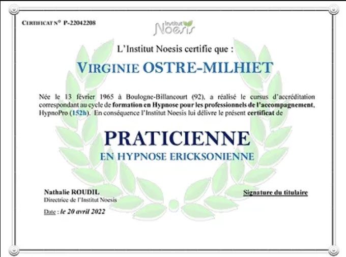 Diplômée en Hypnose Ericksonienne de l’Institut Noésis pour les professionnels de l’accompagnement